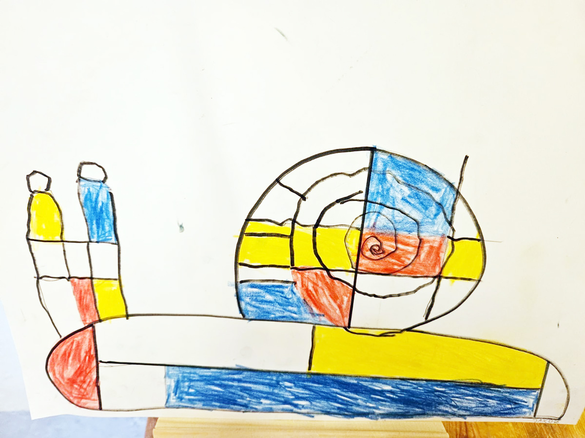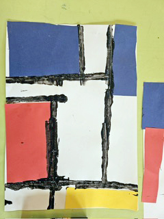 Ergänzend dazu setzten wir uns kreativ mit der Kunst von Piet Mondrian auseinander. Inspiriert von klaren Linien und den Grundfarben Rot, Gelb und Blau gestalteten die Kinder eigene Kunstwerke. Dabei sammelten sie erste Erfahrungen im Bereich der ästhetischen Bildung, schulten ihre Wahrnehmung und entwickelten ihre Feinmotorik weiter.